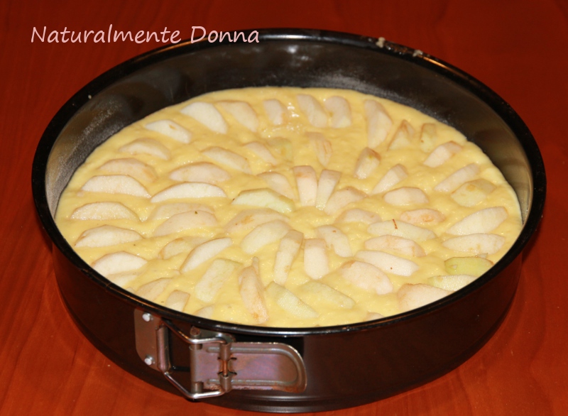 Versate il tutto in una teglia imburrata e infarinata di 24 centimetri di diametro(se più grande verrà solo un po’ più bassa…la mia era di 28 centimetri). Livellate la pasta e inserite a raggiera gli spicchi di mela rimasti.