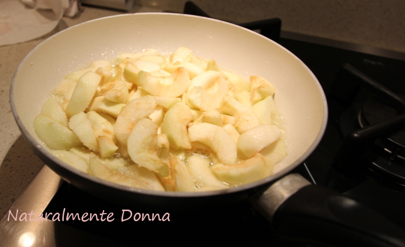 Dopo aver sbucciato le mele e averle tagliate a spicchi, si mettono metà spicchi in un una padella ampia con 20 grammi di burro e 50 grammi di zucchero.