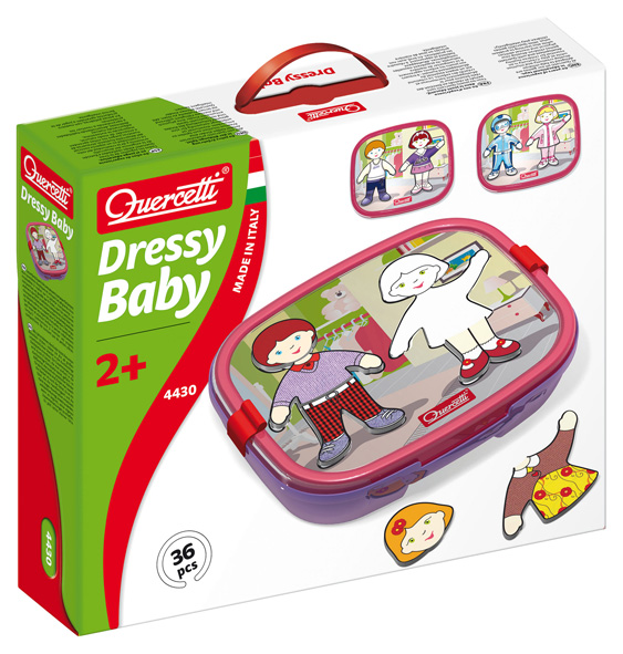 Dressy baby è un gioco prettamente femminile. Non avete mai giocato a vestire le formine di bambini e bambine? In genere le mamme diventano matte a ritagliare tutti i pezzettini che immancabilmente si rompono dopo 2 minuti. Invece con Dressy baby le bambine (0-3 anni) hanno a disposizione 30 vestitini magnetici con cui trovare infinite combinazioni fashion per presentare al meglio i due personaggi, che grazie alla fantasia di ciascuna bambina, potranno essere modificati nell’aspetto fisico – viso e capigliatura – e nell’abbigliamento in generale. Ogni pezzo dovrà essere incastrato nell’apposita impronta e rimarrà ben saldo alla tavoletta grazie alla calamita presente sul retro. Forte vero?
