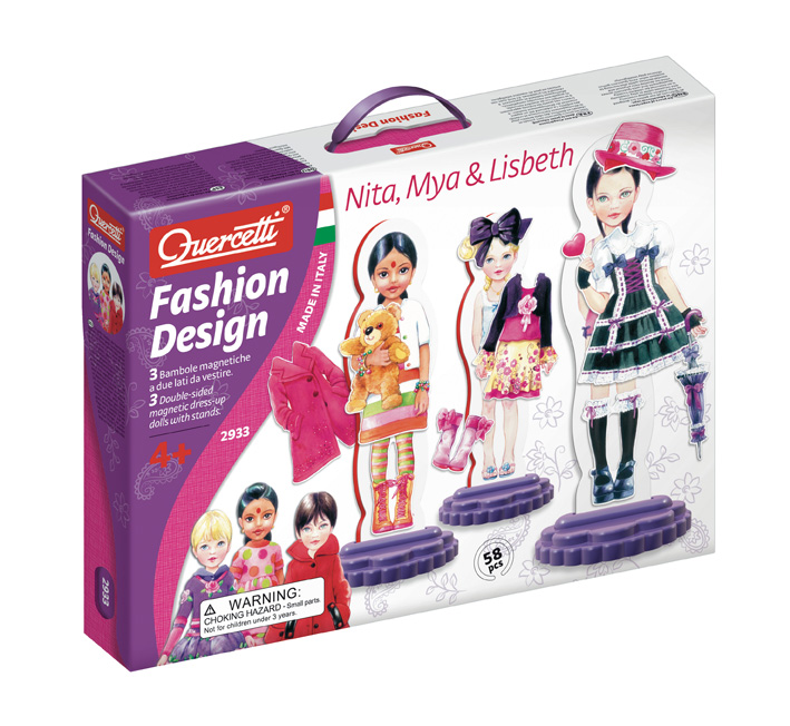 Fashion Design è un gioco che ho in casa, è stato regalato a Veronica e lei si diverte tantissimo! Ho ancora in mente la sua faccia quando ha aperto il regalo! Felicissima! Con “Fashion Design”, infatti le bambine si divertono a trasformarsi in vere stiliste cercando di vestire in mille modi diversi tre bamboline magnetiche Nita, Mya e Lisbeth. Ogni bambolina ha il proprio look e quindi un guardaroba dedicato, dagli abiti alle scarpe, dalle borsette ai gioielli persino diverse tipologie di acconciature per vestire la piccola modella a proprio piacere e secondo il proprio gusto! Ogni bambolina ha due lati su cui giocare: due posture diverse oltreché due acconciature per infinite ore di gioco creativo in piena sicurezza!