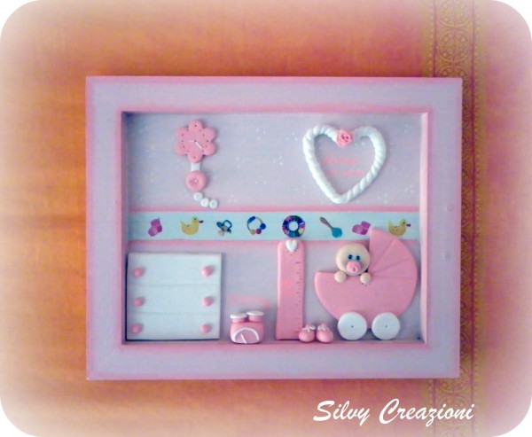 Un quadretto perfetto per la nascita di una bambina, realizzato da Silvia. Dipinto con colori acrilici e decorato con applicazioni in fimo.