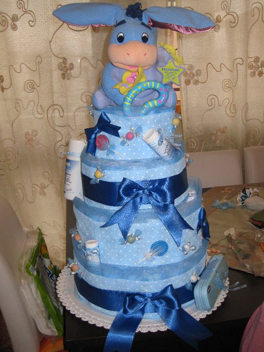 Questa volta è in azzurro, ideale da regalare a un nuovo nato; trovo delizioso il peluche di Ih Oh, amatissimo dai bambini! Tutta la torata è decorata con prodotti per il bagno: creme e saponi, indispensabili, proprio come i pannolini.