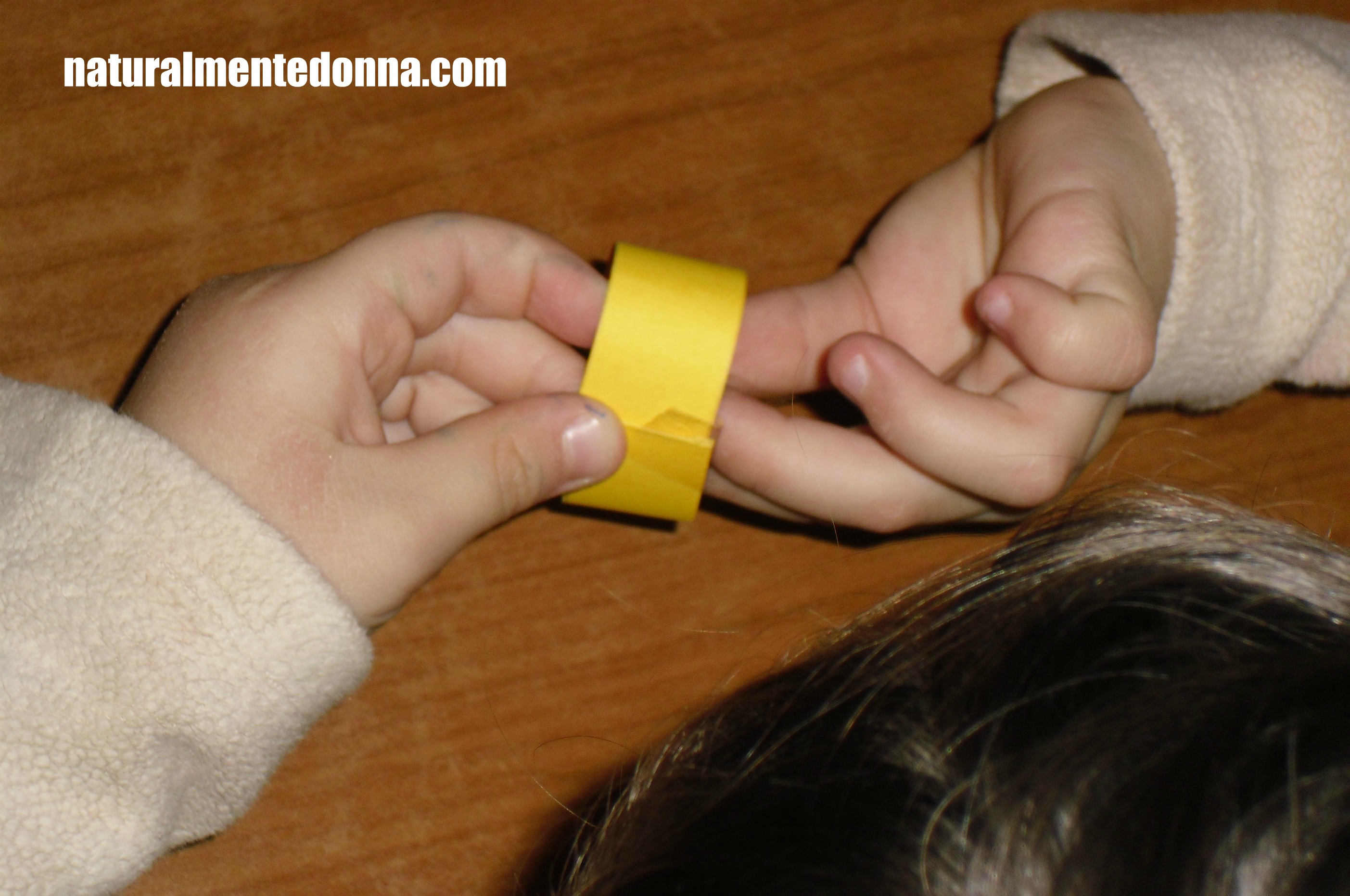 Una volta ritagliate le striscioline bisognerà richiuderle dandogli la forma di un cerchio e chiudendo le due estremità con lo schotc.